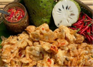 Spicy Salted Dried Soursop is a unique snack made from ripe soursop, blended with chili and shrimp salt to deliver a perfectly balanced flavor of sour, spicy, salty, and sweet. After removing the seeds and simmering with seasonings, the fruit is gently dried to preserve its chewy texture and natural, rich taste.